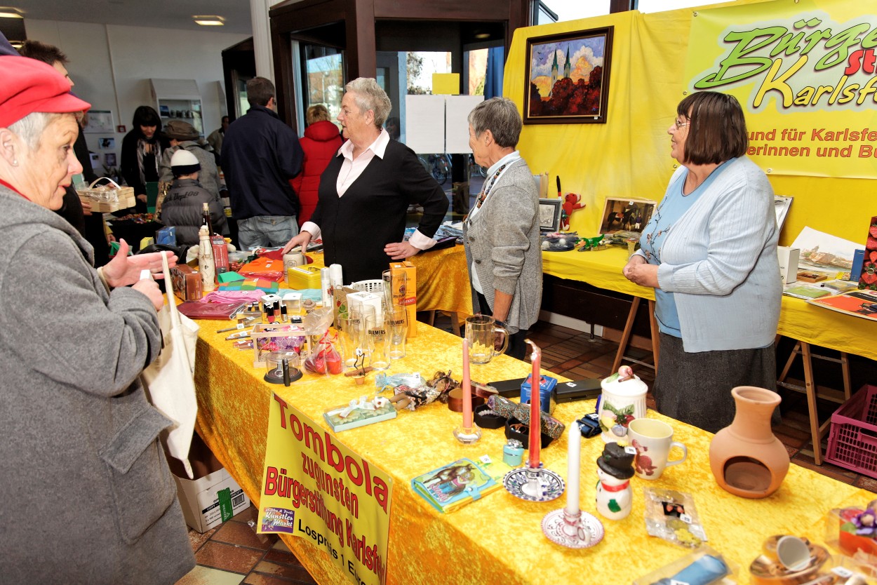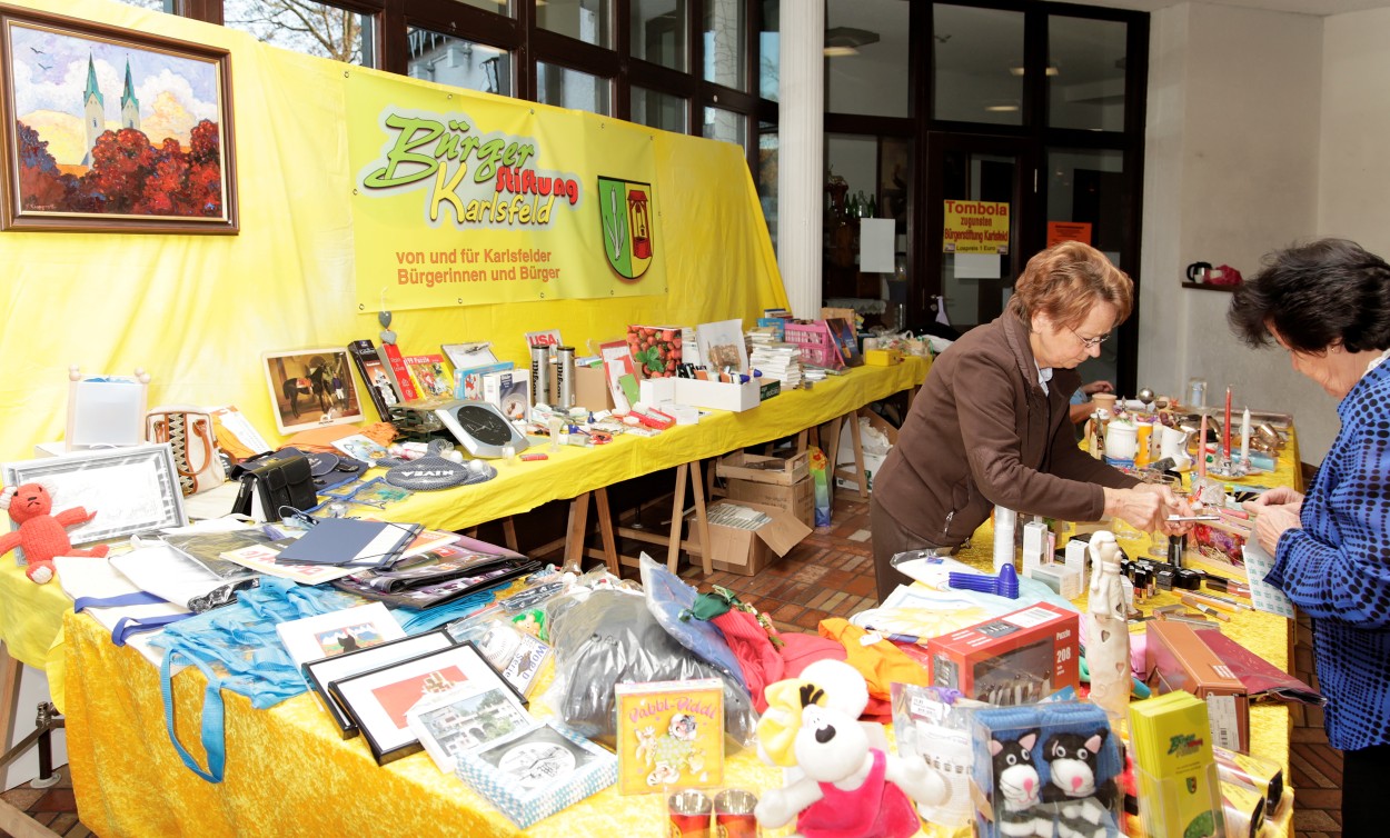 | 27.11.2011auf der Künstlerdult fand wieder die mittlerweile schon traditionelle Tombola zugunsten der Bürgerstiftung Karlsfeld statt Der Erlös betrug diesmal 670,- € Einige Impressionen von der Tombola, aufgenommen von Richard Aicher, dem Initiator von Künstlerdult und Tombola. ![]()