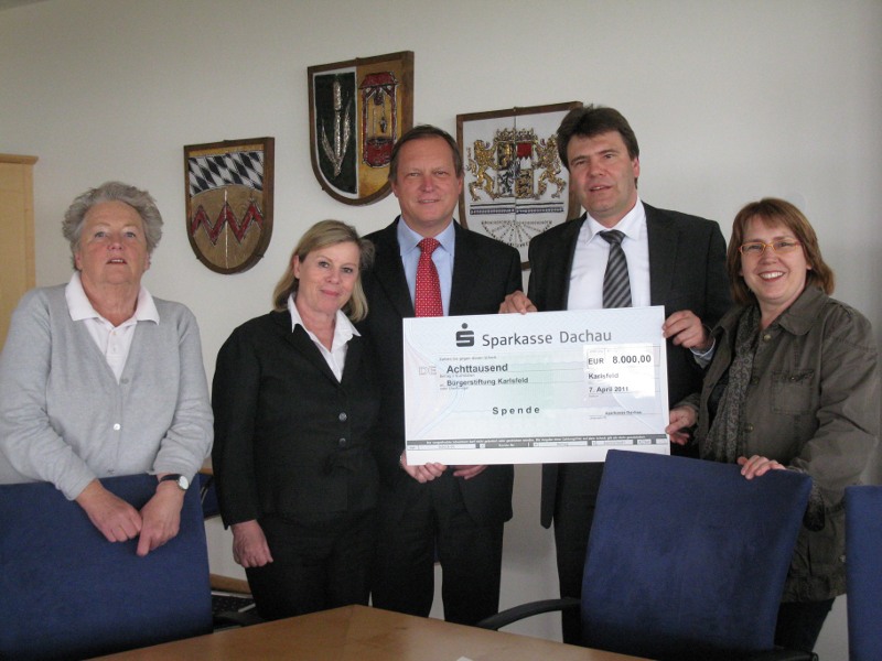 | 07.04.2011 Scheckübergabe Sparkasse Dachau. Um der neuen Bürgerstiftung Karlsfeld zu einem guten Start zu verhelfen spendete die Sparkasse Dachau einmalig 10 % der Stiftungseinlage. |